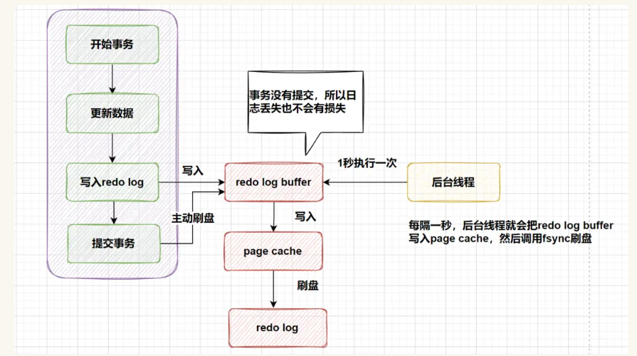 redolog: 是用于保证事务的持久性,在事务提交时写入。 1.redolog(重做日志)是InnoDB存储引擎独有的,它让MySQL有了崩溃恢复的能力。InnoDB存储引擎为redo log的刷盘策略提供了innodb_flush_log_at_trx_commit参数,它支持三种策略:0,2都会有1s的数据损失。 - 0:设置为0的时候,每次提交事务时不刷盘。 - 1:设置为1的时候,每次提交事务时刷盘。 - 2:设置为2的时候,每次提交事务时都只把redo log buffer写入page cache