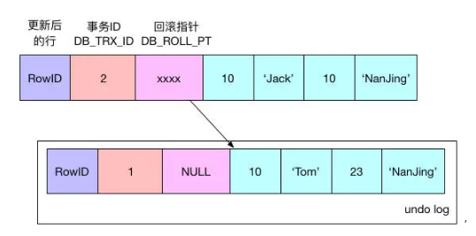 下图右侧绿色的是数据:一行数据记录,主键ID是10,name=‘Jack’,age=10,  被update更新set为name= ‘Tom’,age=23。 事务会先使用“排他锁”锁定改行,将该行当前的值复制到undolog中,然后再真正地修改当前行的值,最后填写事务的DB_TRX_ID,使用回滚指针DB_ROLL_PTR指向undo log中修改前的行DB_ROW_ID DB_TRX_ID: 6字节DB_TRX_ID字段,表示最后更新的事务id(update,delete,insert)。此外,删除在内部被视为更新,其中行中的特殊位被设置为将其标记为已软删除。   DB_ROLL_PTR: 7字节回滚指针,指向前一个版本的undolog记录,组成undo链表。如果更新了行,则撤消日志记录包含在更新行之前重建行内容所需的信息。